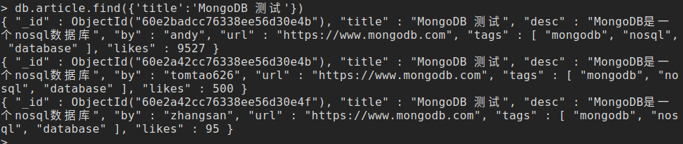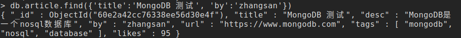 > db.article.find({'title':'MongoDB 测试','by':'zhangsan'})