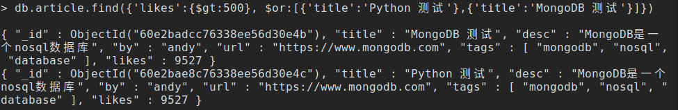 > db.article.find({'likes':{$gt:500}, $or:[{'title':'Python 测试'},{'title':'MongoDB 测试'}]})