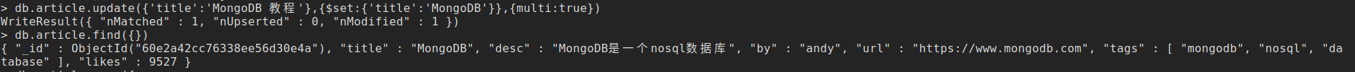 > db.article.update({'title':'MongoDB教程'}, {$set:{'title':'MongoDB'}}, {multi:true})