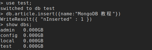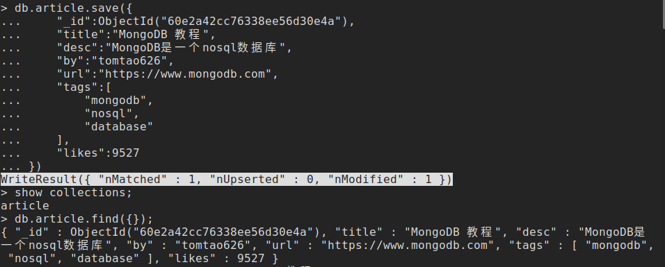 > db.article.insert({title:'MongoDB 教程',desc:'MongoDB是一个nosql数据库',by:'andy',url:'https://www.mongodb.com',tags:['mongodb','nosql','database'],likes:9527})