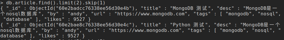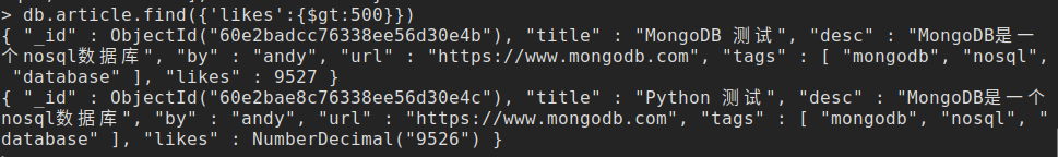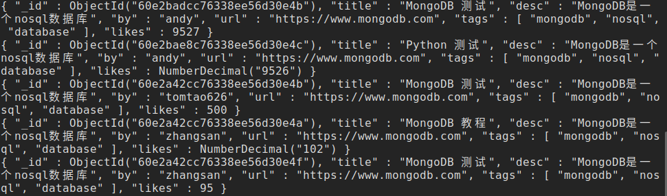 db.article.find().pretty() # { "_id" : ObjectId("60e2a42cc76338ee56d30e4a"), "title" : "MongoDB 教程", "desc" : "MongoDB是一个nosql数据库", "by" : "zhangsan", "url" : "https://www.mongodb.com", "tags" : [ "mongodb", "nosql", "database" ], "likes" : NumberDecimal("102") } { "_id" : ObjectId("60e2badcc76338ee56d30e4b"), "title" : "MongoDB 测试", "desc" : "MongoDB是一个nosql数据库", "by" : "andy", "url" : "https://www.mongodb.com", "tags" : [ "mongodb", "nosql", "database" ], "likes" : 9527 } { "_id" : ObjectId("60e2bae8c76338ee56d30e4c"), "title" : "Python 测试", "desc" : "MongoDB是一个nosql数据库", "by" : "andy", "url" : "https://www.mongodb.com", "tags" : [ "mongodb", "nosql", "database" ], "likes" : NumberDecimal("9526") } { "_id" : ObjectId("60e2a42cc76338ee56d30e4b"), "title" : "MongoDB 测试", "desc" : "MongoDB是一个nosql数据库", "by" : "tomtao626", "url" : "https://www.mongodb.com", "tags" : [ "mongodb", "nosql", "database" ], "likes" : 500 } { "_id" : ObjectId("60e2a42cc76338ee56d30e4f"), "title" : "MongoDB 测试", "desc" : "MongoDB是一个nosql数据库", "by" : "zhangsan", "url" : "https://www.mongodb.com", "tags" : [ "mongodb", "nosql", "database" ], "likes" : 95 }
