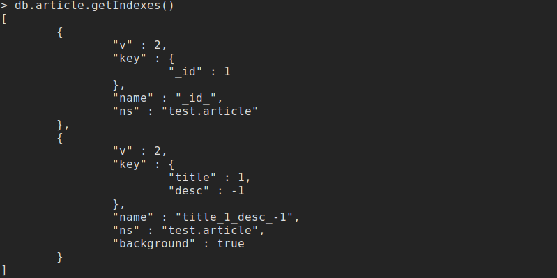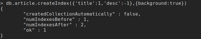> db.article.createIndex({"title":1, "desc":-1},{background:true})