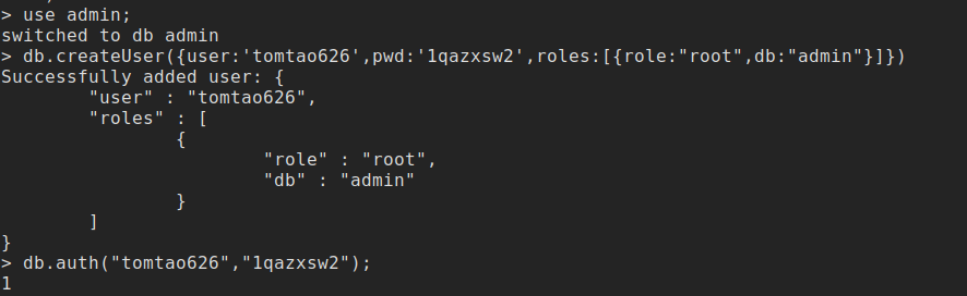 > db.createUser({user:'tomtao626', pwd:'pwd1234', roles:[{role:'root',db:'admin'}]})