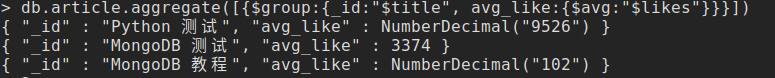 > db.article.addredate([{$group:{_id:"$title", avg_likes:{$avg:"$likes"}}}])