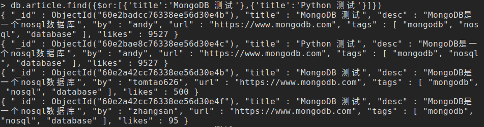 db.article.find({$or:[{"title":"MongoDB 测试"},{"title": "Python 测试"}]})
