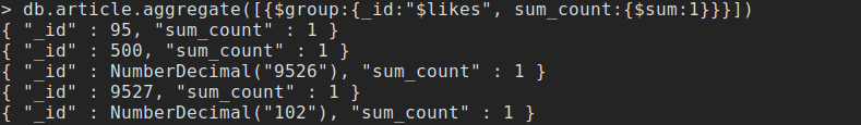 > db.article.aggregate([{$group:{_id:"$likes", sum_count:{$sum:1}}}])