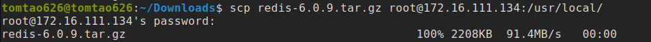 scp redis-6.0.9.tar.gz root@172.16.111.134:/usr/local/等待上传完成