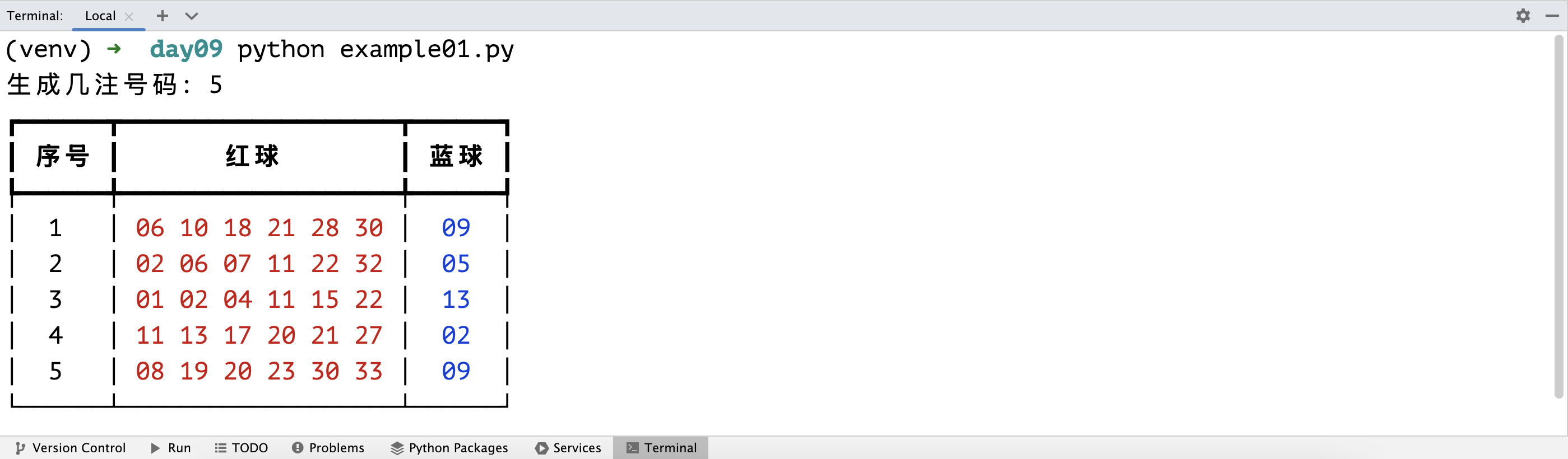 说明:上面代码第 31 行使用了列表生成式语法将红色球号码处理成字符串并保存在一个列表中,