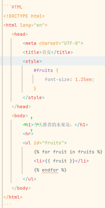 在上面的模板页中我们使用了{{ fruit }}这样的模板占位符语法,也使用了