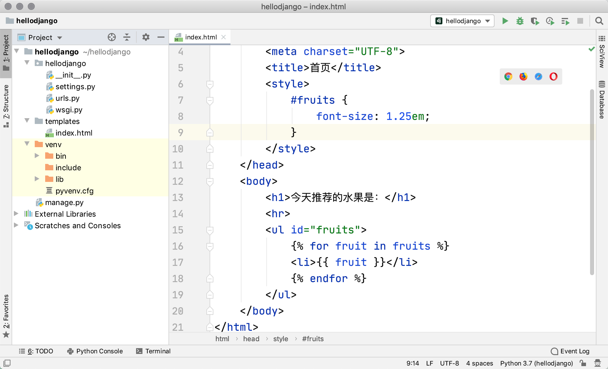 views.py文件并添加如下所示的代码。from random import sample from django.http import HttpResponse def show_index(request): fruits = [ 'Apple', 'Orange', 'Pitaya', 'Durian', 'Waxberry', 'Blueberry', 'Grape', 'Peach', 'Pear', 'Banana', 'Watermelon', 'Mango' ] selected_fruits = sample(fruits, 3) content = '<h3>今天推荐的水果是:</h3>' content += '<hr>' content += '<ul>' for fruit in selected_fruits: content += f'<li>{fruit}</li>' content += '</ul>' return HttpResponse(content) -