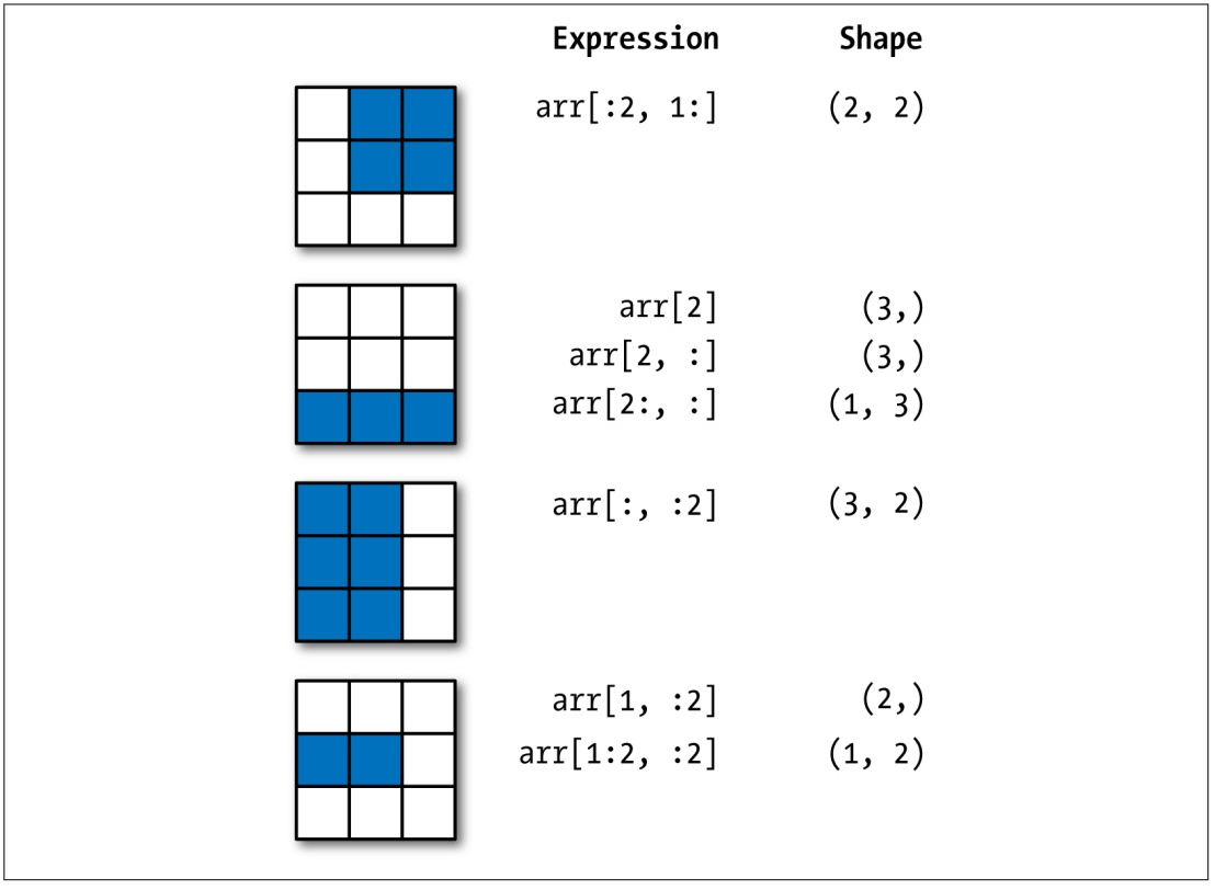 关于数组的索引和切片运算,大家可以通过下面的两张图来增强印象,这两张图来自《利用Python进行数据分析》一书,它是 pandas 库的作者 Wes McKinney 撰写的 Python 数据分析领域的经典教科书,有兴趣的读者可以购买和阅读原书。
