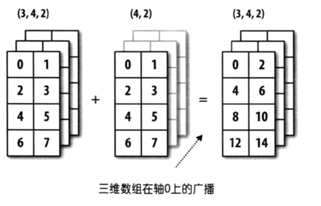 上图中,一个数组的形状是(3, 4, 2),另一个数组的形状是(4, 2),从后往前看对应的部分都是(4, 2),属于后缘维度相同,可以应用广播机制,第二个数组会沿着缺失元素那个轴的方向去广播自己,最终让两个数组形状达成一致。