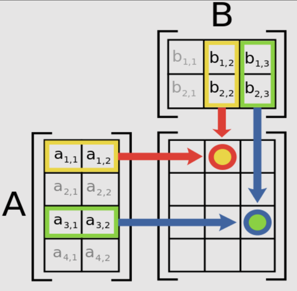 值得一提的是矩阵乘法运算,该运算仅当第一个矩阵 $\small{\boldsymbol{A}}$ 的列数和另一个矩阵 $\small{\boldsymbol{B}}$ 的行数相等时才能定义。如果 $\small{\boldsymbol{A}}$ 是一个 $\small{m \times n}$ 的矩阵, $\small{\boldsymbol{B}}$ 是一个 $\small{n \times k}$ 矩阵,它们的乘积是一个 $\small{m \times k}$ 的矩阵,如下图所示。
