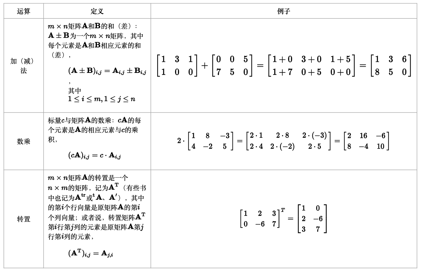 矩阵(matrix)是由一系列元素排成的矩形阵列,矩阵里的元素可以是数字、符号或数学公式。矩阵可以进行加法、减法、数乘、转置、矩阵乘法等运算,如下图所示。