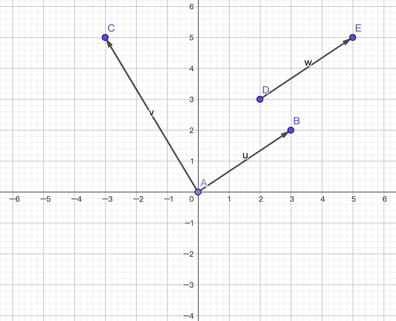 向量(vector)也叫矢量,是一个同时具有大小和方向,且满足平行四边形法则的几何对象。与向量相对的概念叫标量或数量,标量只有大小,绝大多数情况下没有方向。我们通常用带箭头的线段来表示向量,在平面直角坐标系中的向量如下图所示。需要注意的是,向量是表达大小和方向的量,并没有规定起点和终点,所以相同的向量可以画在任意位置,例如下图中 $\small{\boldsymbol{w}}$ 和 $\small{\boldsymbol{u}}$ 两个向量并没有什么区别。