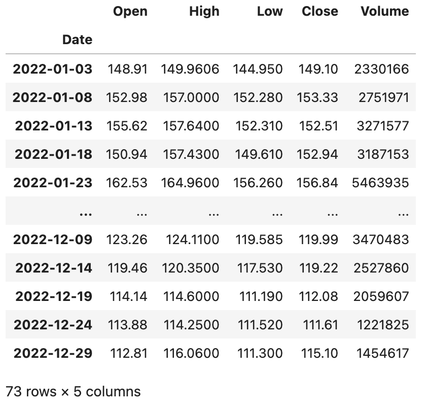 freq=W表示采样周期为一周,它会默认星期日是一周的开始;如果你希望星期一表示一周的开始,你可以将其修改为freq=W-MON;你也可以试着将该参数的值修改为12H,M,Q等,看看会发生什么,相信你不难猜到它们的含义。