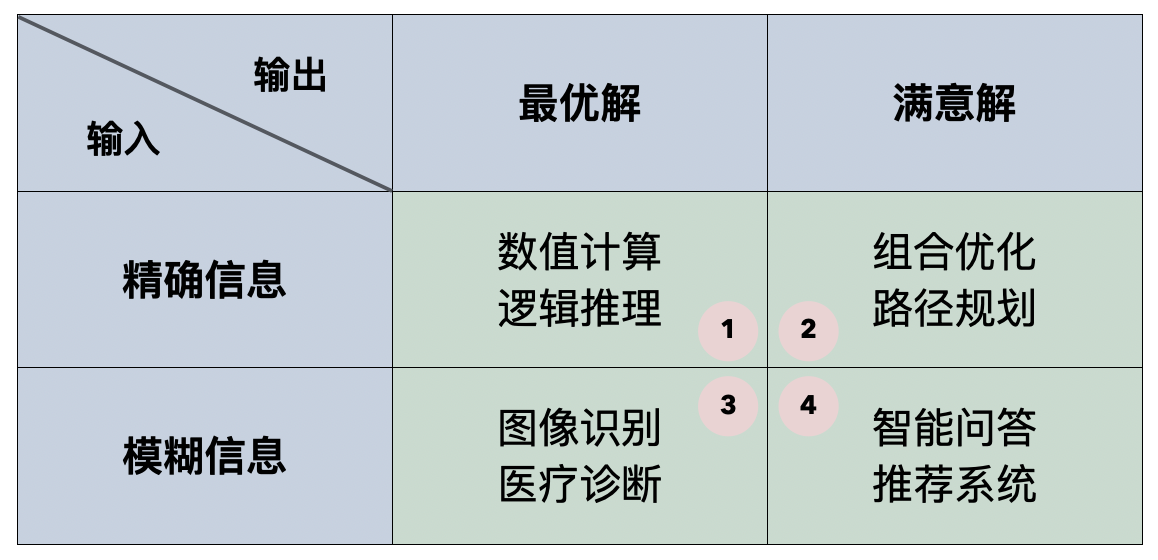 我们可以把需要计算机解决的问题分为四类,分类的依据一方面是输入是精确的还是模糊的,另一方面是输出是最优的还是满意的,我们可以制作出如下所示的表格。可以看出,传统算法擅长解决的只有第一类问题,而机器学习比较擅长解决第三类和第四类问题;第二类问题基本属于 NP 问题(非确定性多项式时间问题),包括旅行经销商问题、图着色问题、集合覆盖问题等,我们通常会采用启发式算法(如模拟退火算法、遗传算法等)或近似算法来解决这类问题,当然机器学习算法也可以为这类问题提供满意解。