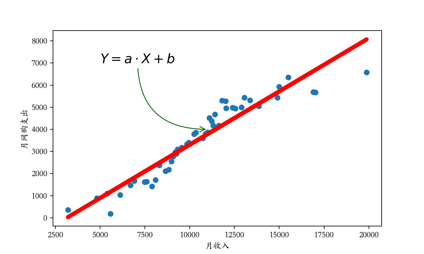 我们换一种思路来预测网购支出,我们将月收入和月网购支出分别作为横纵坐标来绘制散点图。既然网购支出跟月收入之间存在强正相关,这就意味着可以找一条直线来拟合这些历史数据点,我们把这条直线的方程 $\small{y = aX + b}$ 称为回归方程或回归模型,如下图所示。