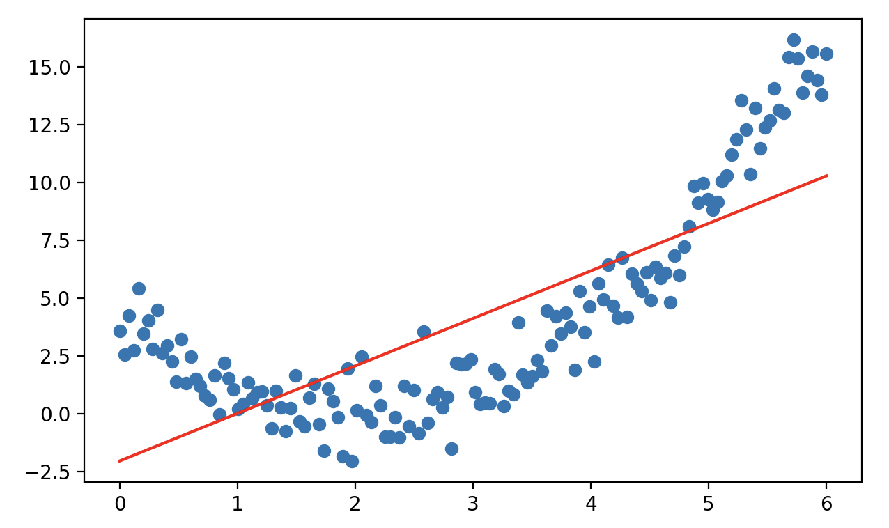 - 多项式回归(Polynomial Regression):引入高阶特征,使模型能拟合更复杂的非线性关系,属于线性模型的扩展,因为因为它对参数 $\small{\beta}$ 的求解仍然是线性形式,如下面所示的二次关系: