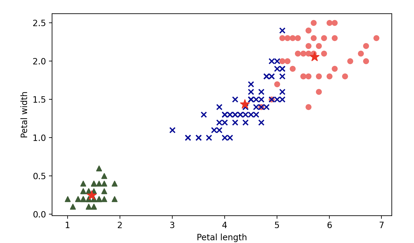 我们仍然以鸢尾花数据集为例,看看我们自己实现的kmeans函数能否为将三种鸢尾花划分为三个不同的类别。由于是无监督学习,这里我们直接把整个数据集带入kmeans函数,代码如下所示。