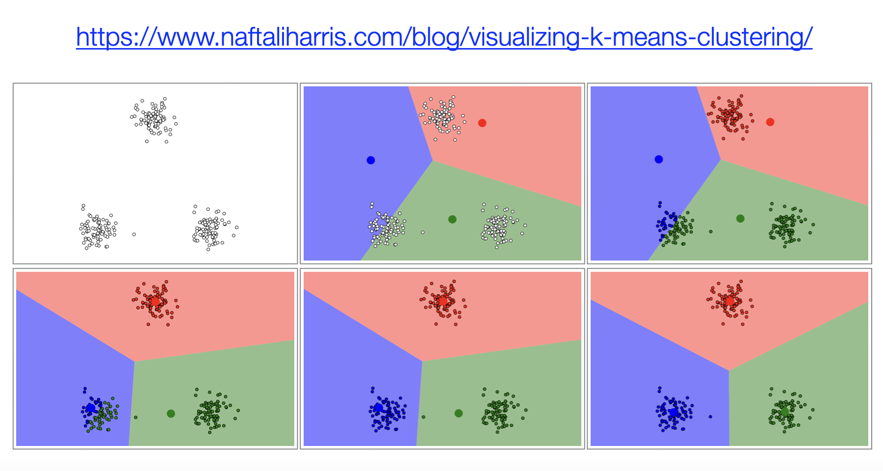 \[C_{i} = \lbrace {x_{j} \ \vert \ {\lVert x_{j} - \mu_{i} \rVert}^{2} \le {\lVert x_{j} - \mu_{k} \rVert}^{2} \ \text{for all} \ k \ne i} \rbrace\]更新质心为簇中所有点的均值,即:
