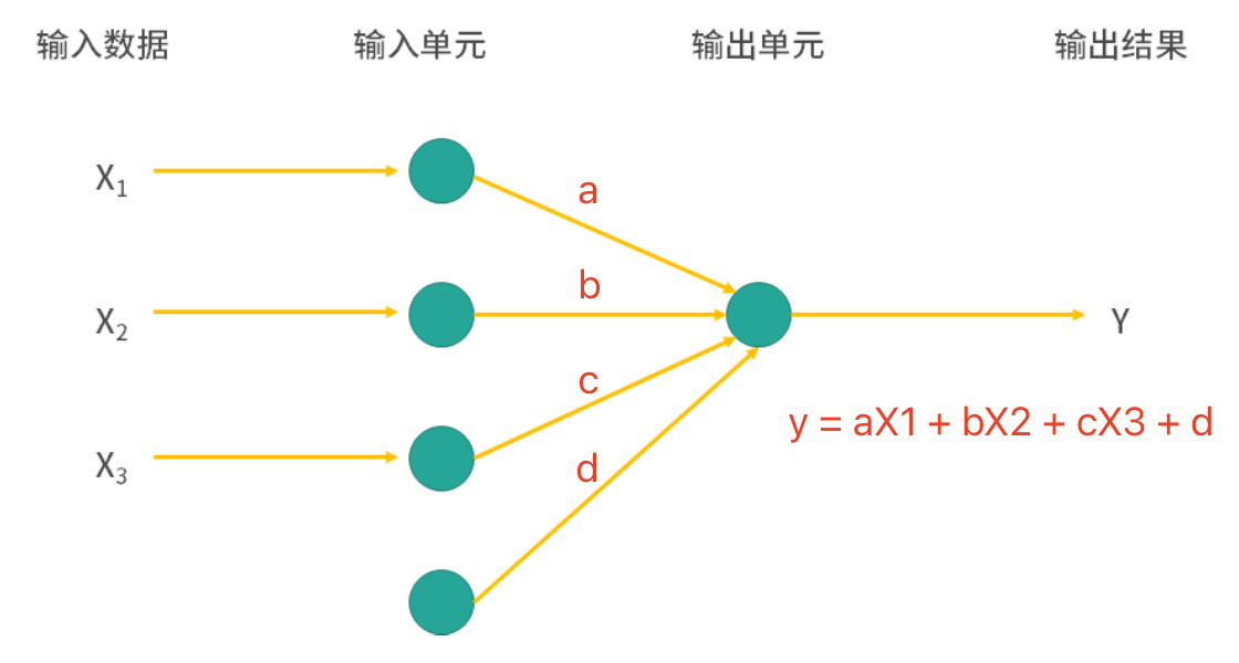 \[y = aX_{1} + bX_{2} + cX_{3} + d\]其中, $\small{a, b, c, d}$ 都是模型的参数(权重和偏置),那么我们的神经网络模型应该是如下图所示的结构。