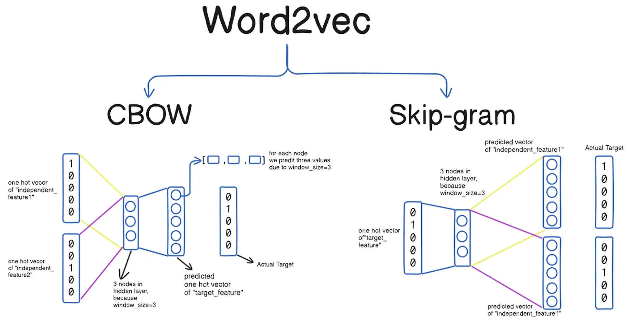 - Word2Vec:通过浅层神经网络训练来学习词向量,分为两种架构:CBOW (Continuous Bag Of Words)和 Skip-Gram。
